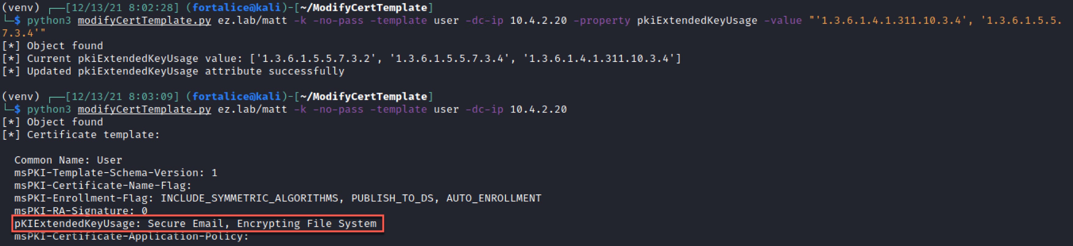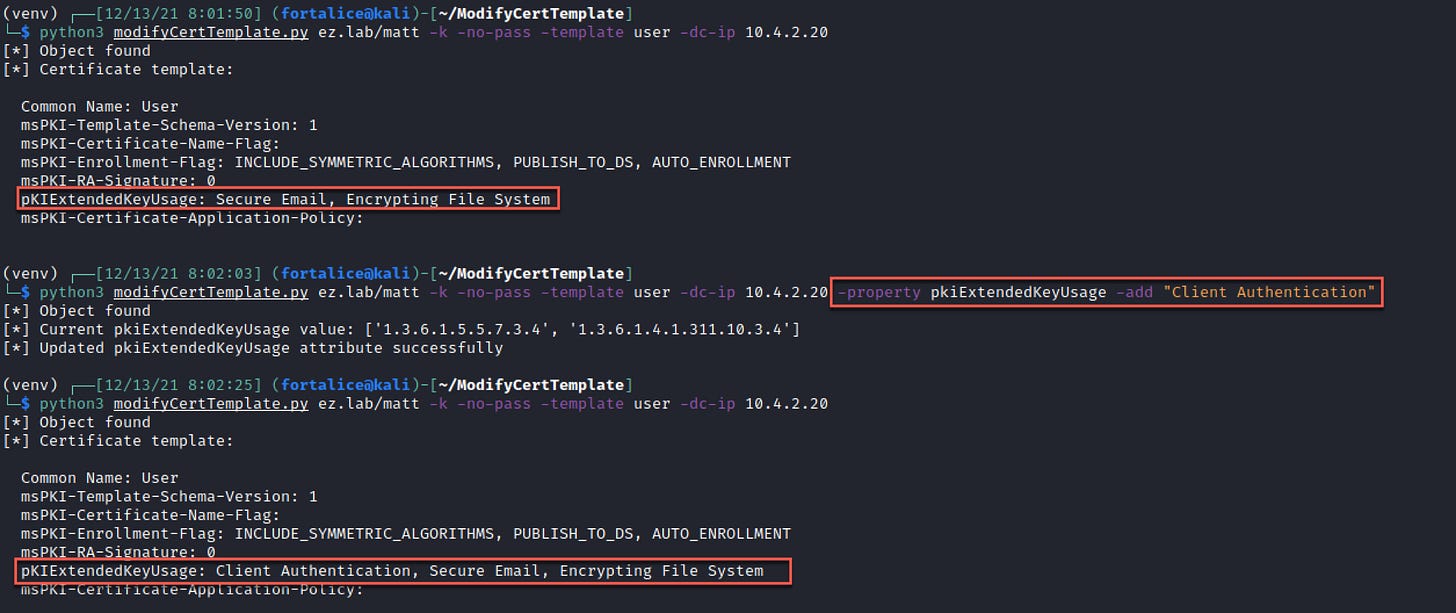 Another potential use is adding an EKU that enables domain authentication, allowing the certificate to be used to obtain a TGT once enrolled in. This can be done by slightly modifying the previous add command.