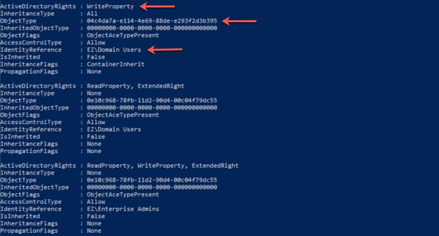 Among a whole list of ACEs returned, we see the ACE delegating WriteProperty permissions to the Domain Users group.