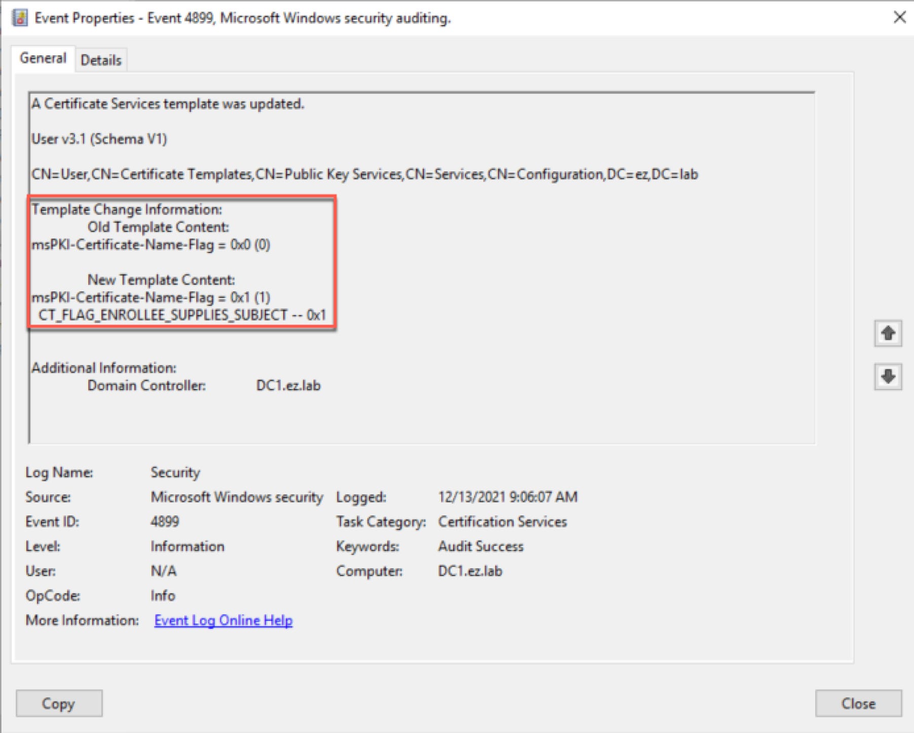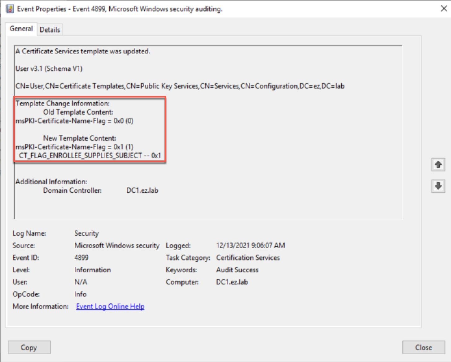 On the detection side, the relevant Windows event ID is 4899. Following the steps outlined by Microsoft here, I was able to get the event to be logged, but with strings attached. Confirming conditions described in the whitepaper, I found event ID 4899 only gets logged if the template is enrolled in after a modification occurs. If a template modification occurs, but the template is not enrolled in, the modification event will NOT be logged. Unfortunately the event data doesn’t contain which account made the modification, but it does contain change information, including the old and new values.