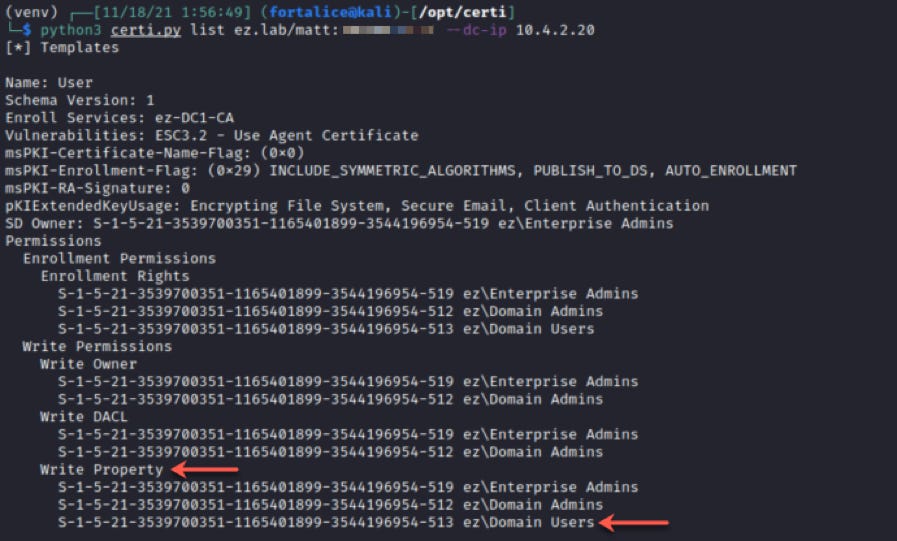 Let’s start off with template enumeration - my go-to tool for this from Kali is certi.py, which has a list command for enumeration. Sorting through the output for potential misconfigurations and escalation paths, I found a template on which Domain Users were granted enrollment rights AND WriteProperty permissions.