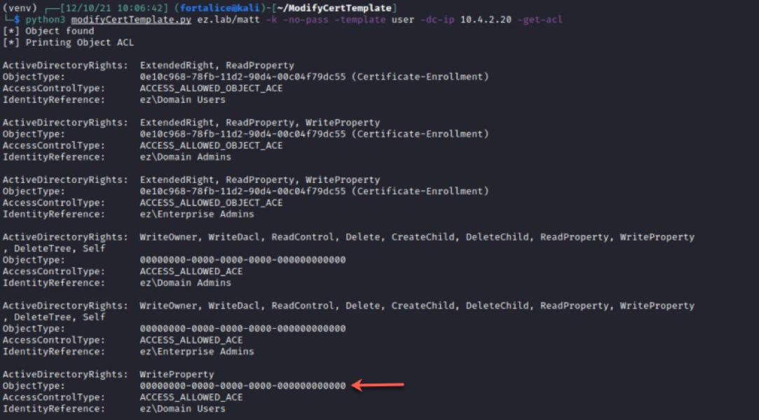I ended up creating a Python tool to address those questions, which has come in handy on a few tests since its inception. Using it, we can return to checking the template’s ACL, without the baggage of finding somewhere suitable to run PowerShell: