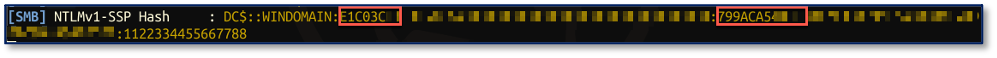 So, what happened? The printer bug caused the target to authenticate back to the attacker-supplied IP, where the machine account’s hash was captured with Responder. The hash type is identified as NTLMv1-SSP, which is important because the attack cannot proceed if a NTLMv2 (Net-NTLMv2) hash is captured instead. Also, notice how the two response portions of the hash do not match