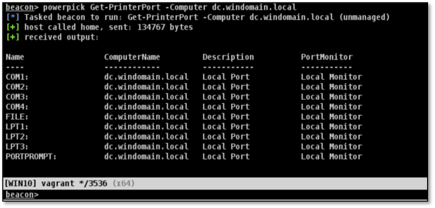 PowerShell’s Get-PrinterPort can be used to check if Spooler is running on a remote host. The example below uses Cobalt Strike’s powerpick beacon command. (A bunch of errors will be encountered if the remote host is not running Print Spooler.)