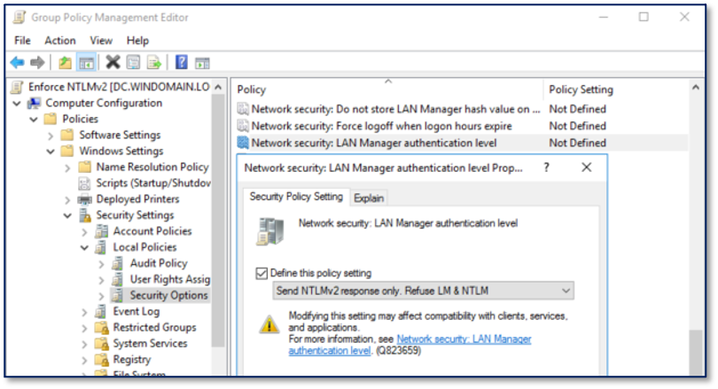 Warning: If any applications rely on NTLMv1 authentication, this GPO will break that functionality. It is recommended to test this policy before deploying across the environment.