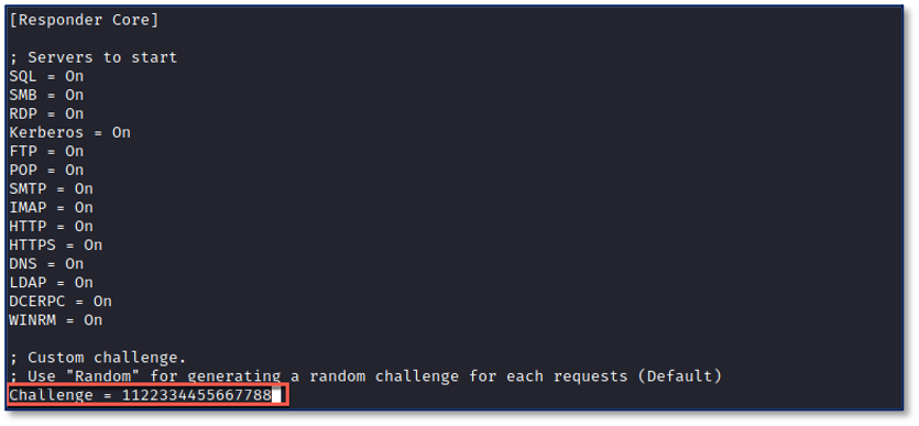 First, ensure that Responder’s challenge is set to 1122334455667788 in Responder.conf: