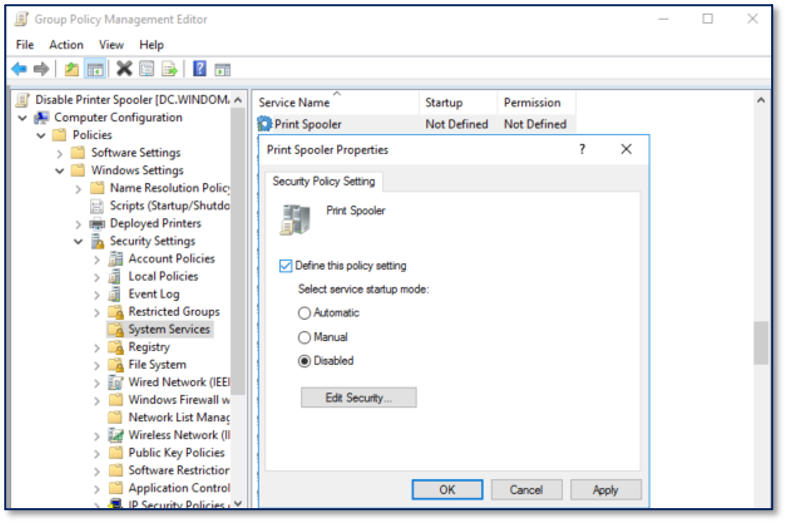 The setting to edit is ComputerConfiguration\Policies\Windows Settings\Security Settings\System Services\PrintSpooler. Set this to Disabled to stop the service from running and prevent the printer bug from being leveraged.