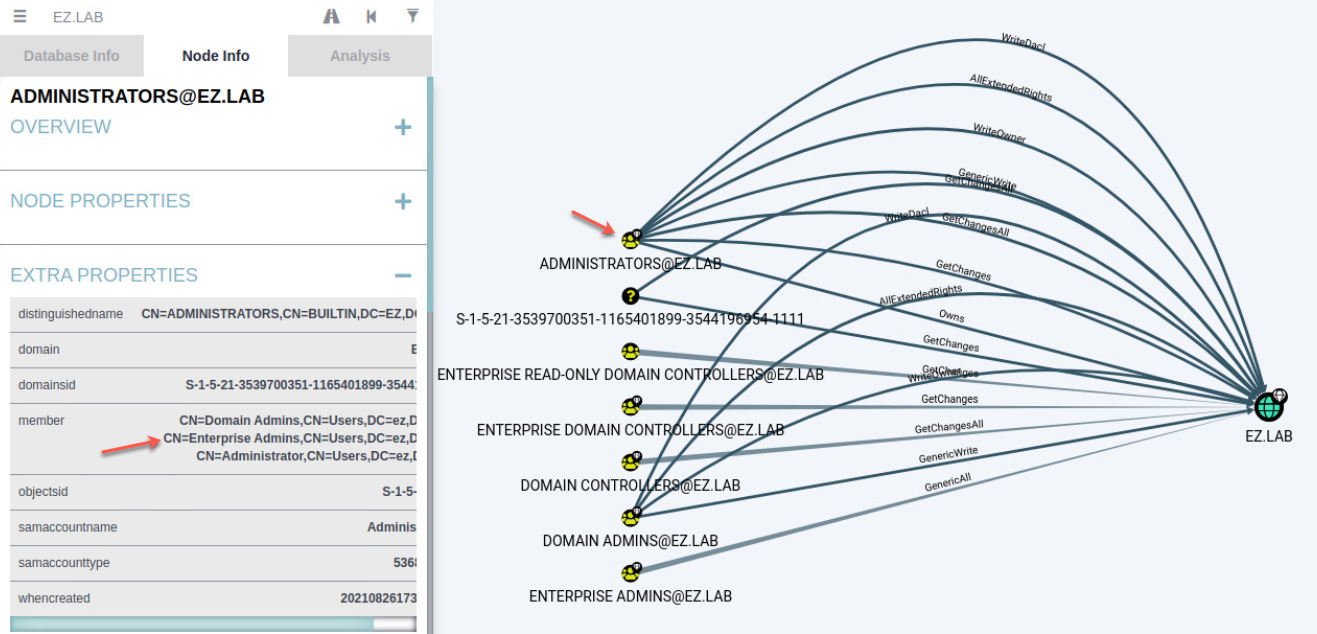 (objectSid=S-1-5-21-3539700351-1165401899-3544196954-498)Rerun BOFHound, load the output into BloodHound and now the graph is looking more filled in. Additionally, if we now click on one of the group objects we can see the distinguished names of members: