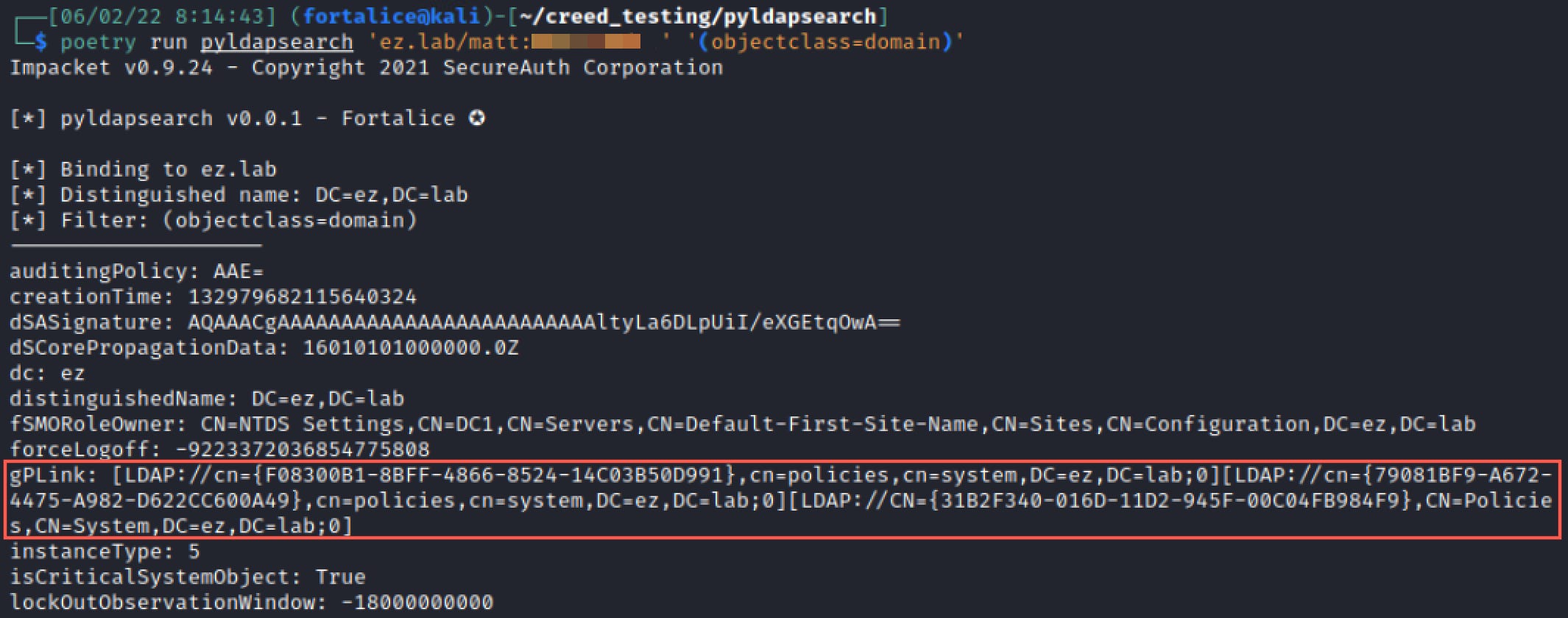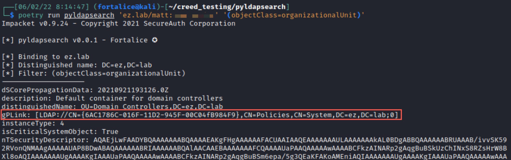 All of that was possible in the original release so what’s new in BOFHound 0.1.0? In this release, we’ve added support for OU and GPO objects, as well as parsing out domain trust relationships (those can be queried with ‘(objectClass=trustedDomain)’). Targeted enumeration of OUs and linked GPOs will work similarly to the groups and group members from above. As an example, in my lab, I’ll query all OUs, but if you’re targeting some specific subset of machines (i.e., Citrix servers), you could try a query filter similar to ‘(&(objectClass=organizationalUnit)(|(ou=*citrix*)(ou=*ctx*)))’.