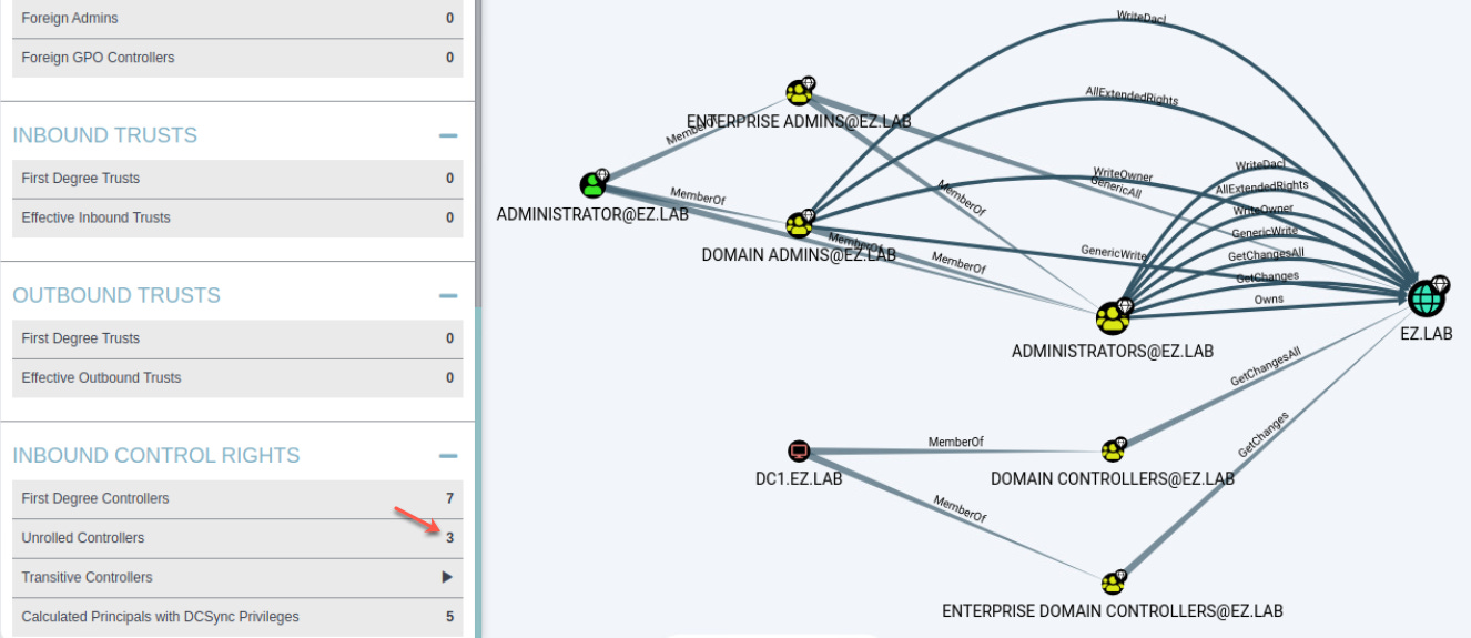 (sAMAccountName=DC1$)Rerun BOFHound, reimport to BloodHound and we can now see the unrolled controllers related to the target domain: