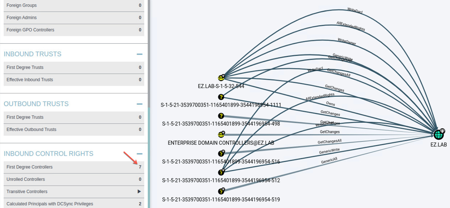 Several JSON files will be written, which we’ll upload to BloodHound. Locating the domain object in the BloodHound GUI, we can head to the Inbound Control Rights section and click the number associated with First Degree Controllers. This will us a graph that looks something like this, where we can see objects (ones we haven’t queried) by their SIDs and their rights over the domain object.