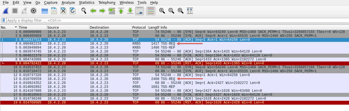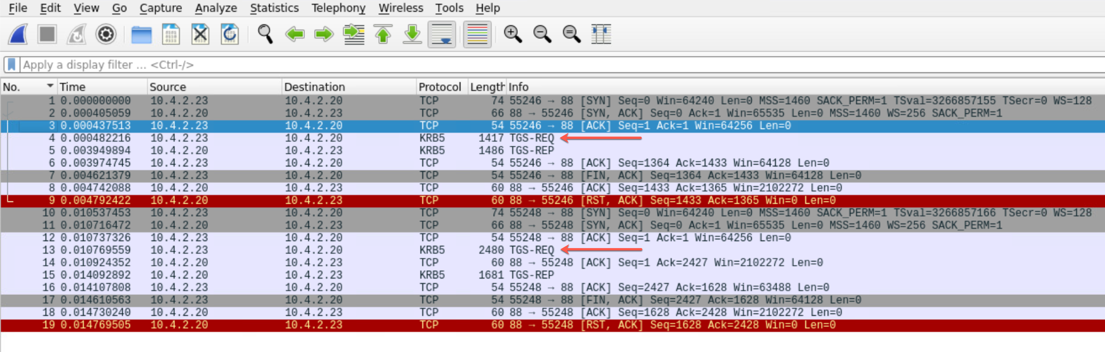 Impacket reports that it successfully obtained and saved a service ticket for the administrator account through S4U2Self and S4U2Proxy. At this point we can finish our lateral move to WS1.EZ.LAB, but what is really going on under the hood? Capturing this step with Wireshark, we see two TGS-REQ messages from Kali to the KDC and two TGS-REP messages sent back by the KDC.