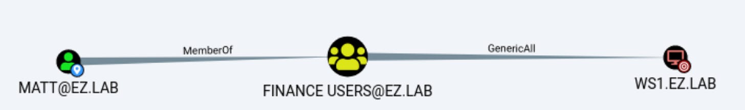 Let’s start with how to find scenarios allowing RBCD in BloodHound. For the purposes of this blog, we’ll assume that I’ve already compromised the EZ\matt account, a basic domain user, and used it to collect BloodHound data. To configure the lab in a vulnerable state, I’ve granted the Finance Users group GenericAll permissions over the WS1.EZ.LAB machine. Either GenericAll or GenericWrite privileges will directly allow modifications to the target computer object for RBCD takeover.