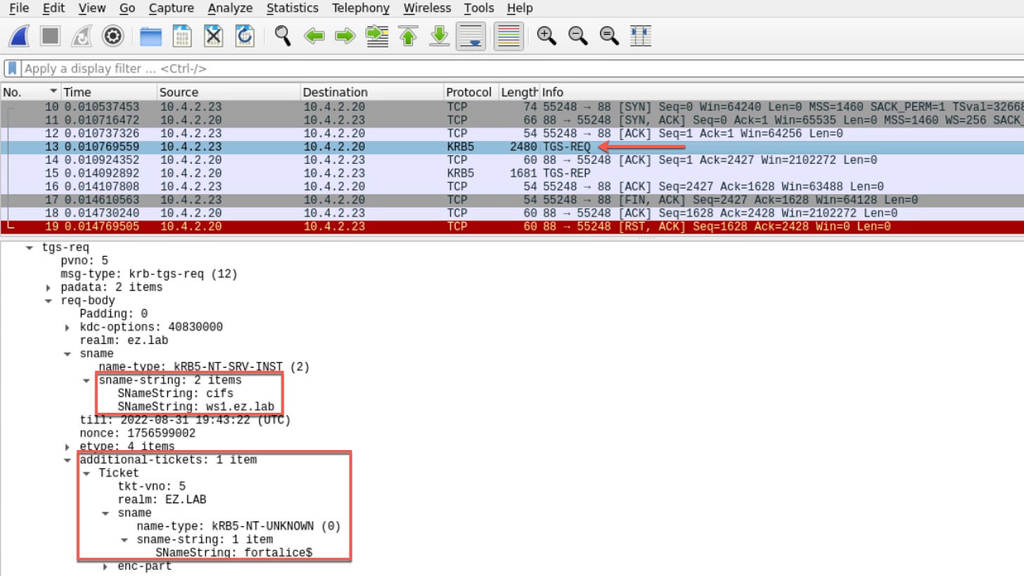 After the KDC responds with the S4U2Self ticket, S4U2Proxy is used to request a TGS ticket to a different service as the user impersonated during S4U2Self. Opening the associated TGS-REP shows that we’re requesting a ticket for cifs/ws1.ez.lab and including the forwardable S4U2Self ticket in the additional-tickets section. This is the point where the KDC will perform a check to ensure that FORTALICE$ has the required delegation rights (which we set with rbcd.py) before returning the ticket that allows access to WS1.EZ.LAB.