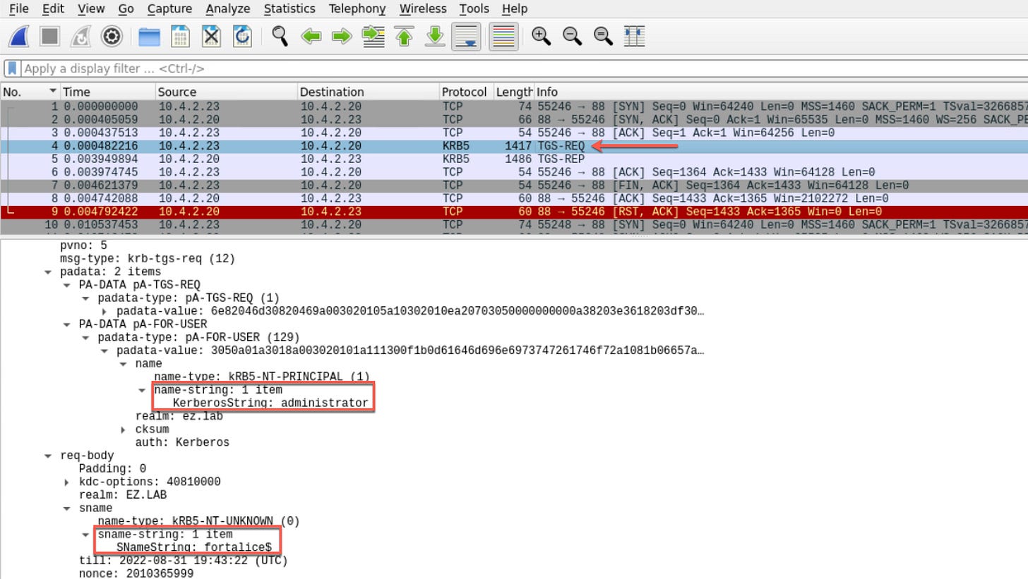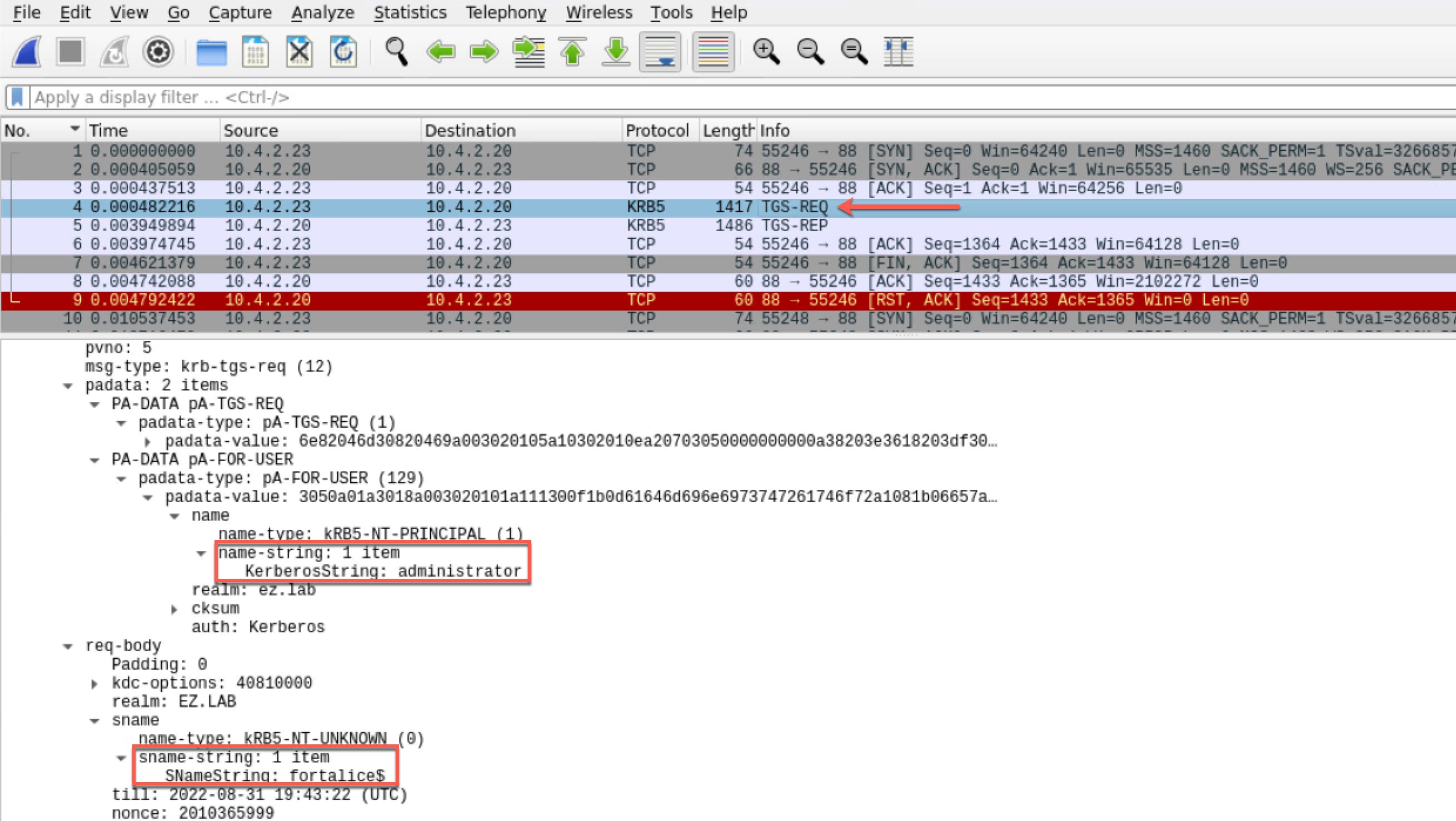 The first of these sequences is the S4U2Self request and response. The S4U extensions are better explained here, but S4U2Self essentially allows a service to obtain a forwardable ticket to itself, for another user. Examining the TGS-REQ message, we can see that we’re requesting a ticket on behalf of EZ\Administrator for the service fortalice$. Elsewhere in the kdc-options section of the req-body, the forwardable flag is set.