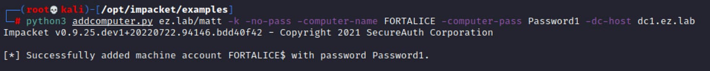python3 addcomputer.py ez.lab/user:pass -computer-name FORTALICE -computer-pass password