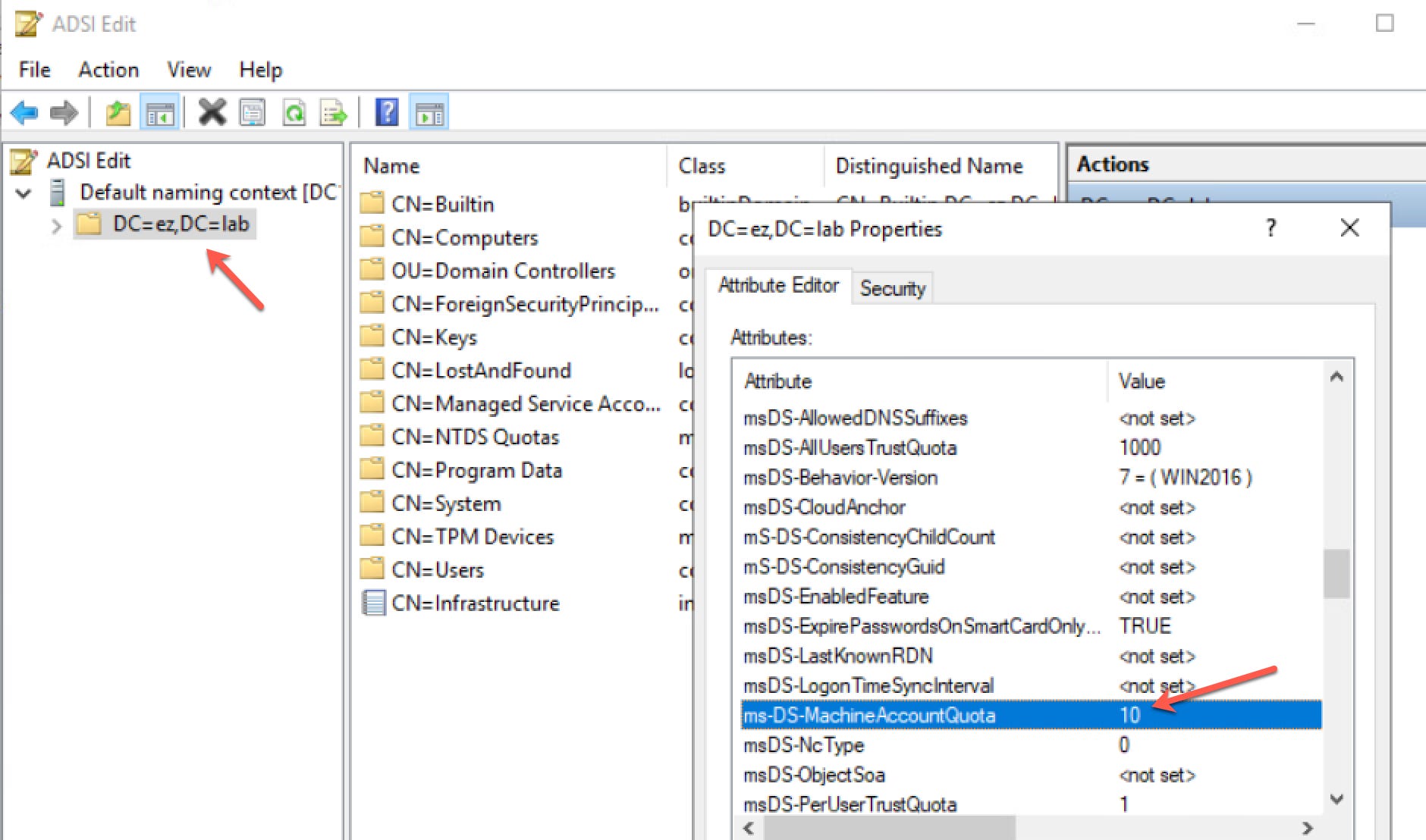 ms-DS-MachineAccountQuotato 0, instead of the default value of 10. This can be done through the ADSI Edit application on a DCWhile not enough on its own, it will at least require the attacker to obtain control of a machine account through some other means than just simply adding one