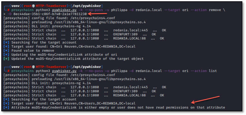 The last important note is that the KeyCredential we set with PyWhisker can be safely be removed using the remove action in conjunction with the DeviceID corresponding to the KeyCredential we generated. After removal, we can verify it no longer exists with the list action.