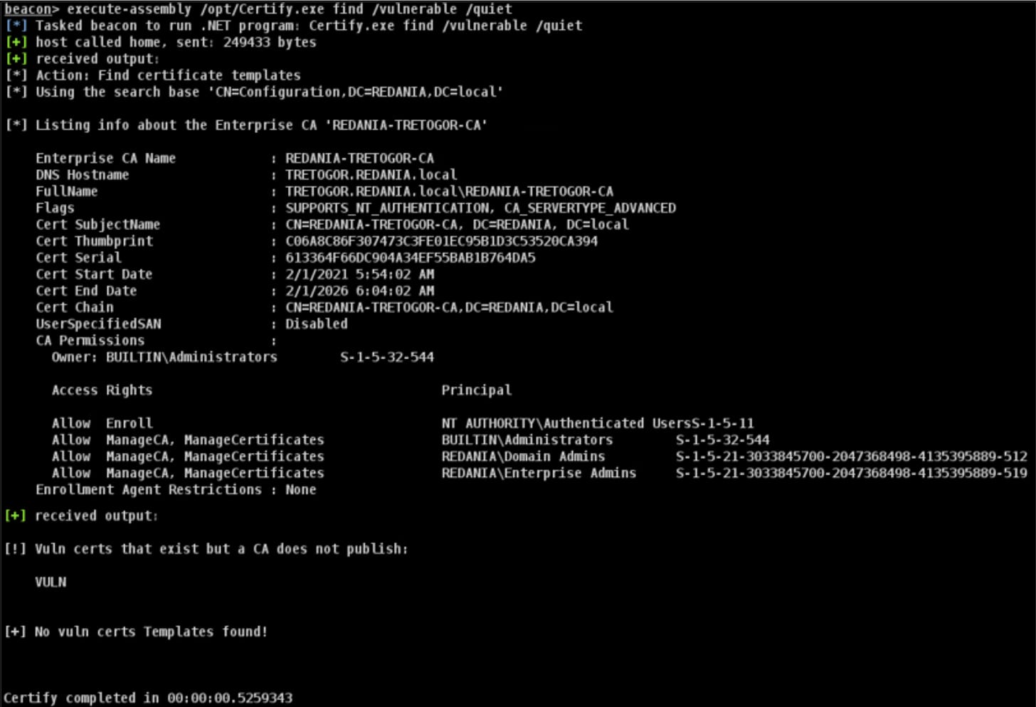 We can perform an initial check for vulnerable templates with Certify from beacon. Ultimately, no vulnerable certificates are found – the one vulnerable template, VULN, is not published by the CA.