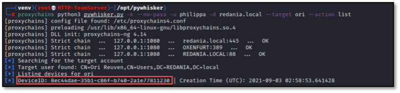 In the output, we can see the DeviceID corresponding to the new KeyCredential and the new PFX certificate file (and password for the PFX file). We can verify that the KeyCredential has been set by using PyWhisker’s list action: