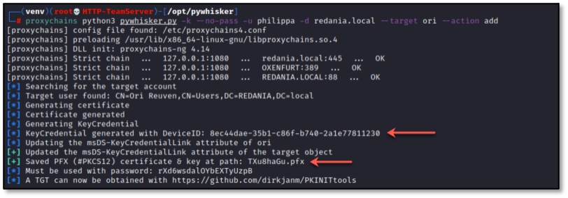 After ensuring proxychains configurations are set, I will start off by setting the KRB5CCNAME environment variable to the location of the previously stolen TGT for REDANIA\philippa. In the subsequent command, Kerberos authentication is used with PyWhisker’s add action to authenticate to a domain controller (Oxenfurt) and add a KeyCredential to Ori’s user object: