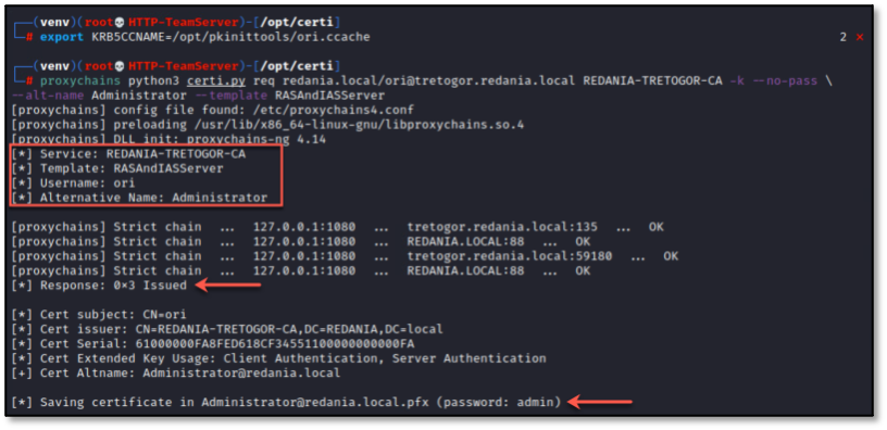 Returning to our main objective, ADCS, we have now compromised an account belonging to the Tier 1 Admins group, which can enroll in the certificate identified earlier. Certi will be used to perform ADCS exploitation through the SOCKS proxy. Again, start by exporting the latest Kerberos TGT we obtained. The certi.py arguments are specifying my lab’s CA server (Tretogor, which doubles as a CA and DC), Kerberos authentication, the SAN (we want a certificate for REDANIA\Administrator) and the vulnerable template to enroll in: