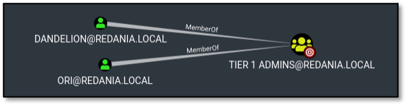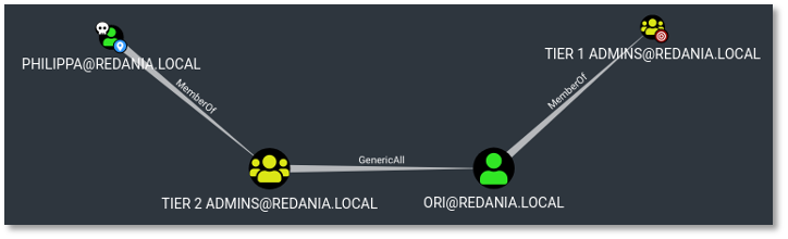 Both of these accounts are solely members of the Domain Users and Tier 1 Admins groups. In theory, these accounts are significantly privileged, but not as privileged as Domain Admins. Using BloodHound again, we can do some pathfinding to see if we have any ways to compromise one of these accounts. Similar to our position during the real engagement, assume we have already used our initial access to compromise Kerberos ticket-granting-tickets (TGTs) for a handful of users, including REDANIA\philippa: