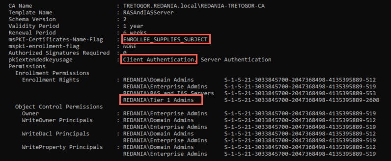 Enrollment rights contains the normal domain/enterprise admins, but also an additional group, REDANIA\TIER 1 ADMINS.