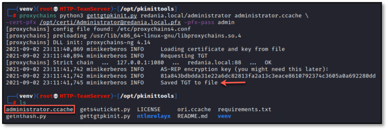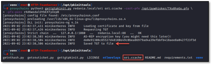 After the Shadow Credentials have been set, we can use the PKINITtools suite to request a TGT as REDANIA\Ori. The gettgtpkinit.py script used with references to the PFX file and password generated with PyWhisker will result in a valid TGT for Ori: