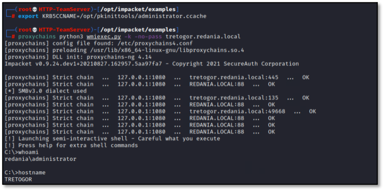 I will verify the validity of the TGT by opening a wmiexec shell on one of the lab DCs as REDANIA\Administrator: